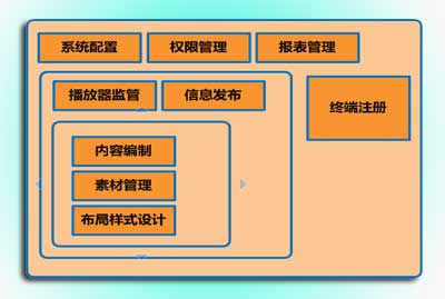 盈视通信息发布平台由多个子系统构成,包含有素材上传管理子系统,权限管理子系统,布局样式设计子系统,内容编制子系统,信息发布子系统,播放器监管子系统,终端注册子系统,报表子系统,系统配置子系统等。